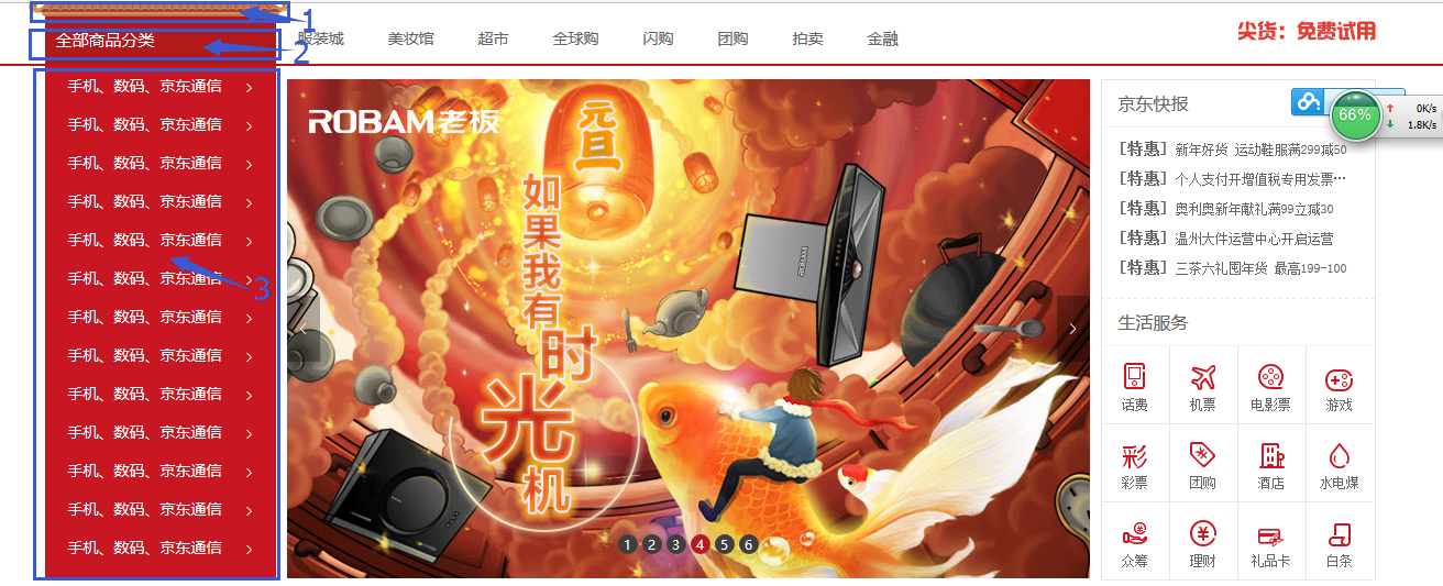 在nav_left的盒子裡有3塊大內容,分別是如圖的1,2,3,它們同屬於nav_left裡面,因為都屬於分類商品的內容,1和2相當於是裝飾展示的作用,把布局排好就行