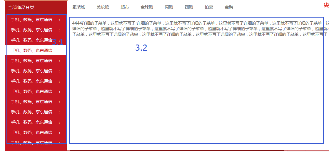 在dd的盒子(也就是第3模塊)裡面,分別有左邊紅色背景的這個導航分類的大盒子(nav_list)3.1,和右邊鼠標滑過之後才顯示的白色背景的盒子(nav_detailBox)3.2,經常寫這種布局的肯定知道是用定位布局才能實現,所以這裡也是用定位來實現的布局。