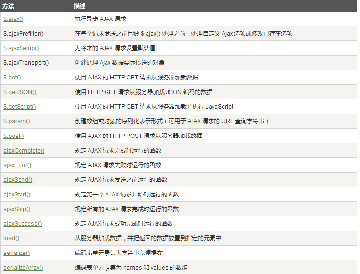 下面的表格列出了所有的 jQuery AJAX 方法: