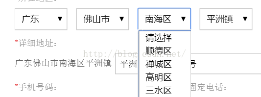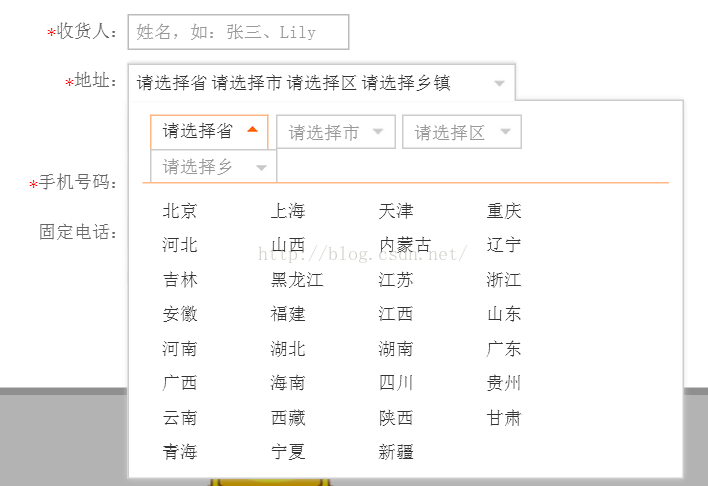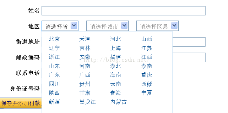 公司的省市縣數據比較坑爹,是通過ehr系統那邊生成ID來匹配,比如福建省 對應ID 01211014AOP145,城市也對應一個ID,然後區縣就不管了。然後我就網上找了一堆資源 插件什麼的感覺都不適用就決定自己寫一個。因為自己也是半桶水的那種界面都不知道怎麼弄,弄哪種格式,什麼風格,配色啊。就默默的找了京東、亞馬遜、淘寶、當當等他們關於省市區是怎麼做的。圖如下: