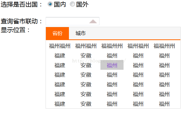 <head> <title>省市二級聯動可擴展性</title> <script type="text/javascript" src="Scripts/jquery-1.9.1.min.js"></script> </head> <body> <label>選擇是否出國:</label> <input type="radio" name="radio1" value="1" />國內 <input type="radio" name="radio1" value="2" />國外<br /><br /> <label>查詢省市聯動:</label> <input type="text" id="txt_proCity" onkeyup="GetOutCounty()" readonly="readonly" runat="server" /> <input type="button" id="btnImg" class="btn_img1" name="img1" onclick="changeImg()" /><br /> <label>顯示位置:</label><br /> <div id="divProCity"> <ul class="headMenu"> <li class="liDefault">省份</li> <li>城市</li> [html] view plain copy <li>國外</li> </ul> <div class="liDiv1"> <ul> <li>福州福州</li> <li>福州福州</li> <li>福福州州</li> <li>福州福州</li> <li>福福州州</li> <li>福建</li> <li>安徽</li> <li>福州</li> <li>福州</li> <li>福州</li> <li>福建</li> <li>安徽</li> <li>福州</li> <li>福州</li> <li>福州</li> <li>福建</li> <li>安徽</li> <li>福州</li> <li>福州</li> <li>福州</li> <li>福建</li> <li>安徽</li> <li>福州</li> <li>福州</li> <li>福州</li> <li>福建</li> <li>安徽</li> <li>福州</li> <li>福州</li> <li>福州</li> <li>福建</li> <li>安徽</li> <li>福州</li> <li>福州</li> <li>福州</li> </ul> </div> <div class="liDiv2"> <p style="text-align:center;color:#F60"><strong>請先選擇省份!</strong></p> </div>