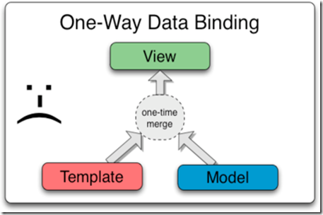 有許多的模板引擎都被設計為模板(template)和數據(model)的合並返回一個字符串,再利用innerHTML追加在DOM節點,這以為則數據的任何改變都必須重新合並生成新的內容追加在DOM上。形如下圖屬於單向綁定技術: