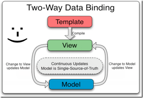 而Angular則不同利用directive指令而非字符串,返回值是一個合並數據model的link function。view和model的綁定是自動,透明的,不需要開發人員添加額外的action去更新view,Angular在這裡不僅是數據model的綁定,還有行為概念。作為雙向的綁定,形如下圖: