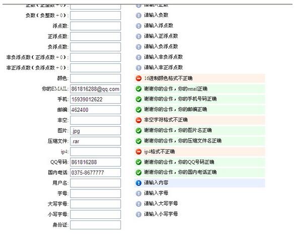 $("#ys").formValidator({ onShow: "請輸入16進制顏色", onCorrect: "謝謝你的合作,你的16進制顏色正確" }).regexValidator({ regExp: "color", dataType: "enum", onError: "16進制顏色格式不正確" });