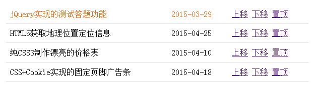 <table class="table"> <tr> <td>HTML5獲取地理位置定位信息</td> <td>2015-04-25</td> <td><a href="#" class="up">上移</a> <a href="#" class="down">下移</a> <a href="#" class="top">置頂</a></td> </tr> <tr> <td>CSS+Cookie實現的固定頁腳廣告條置頂</a></td> </tr> ... </table>