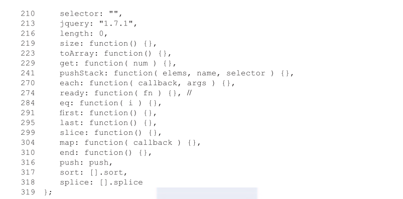 constructor: jQuery, // Start with an empty selector selector: "", // The current version of jQuery being used jquery: "1.7.1", // The default length of a jQuery object is 0 length: 0,