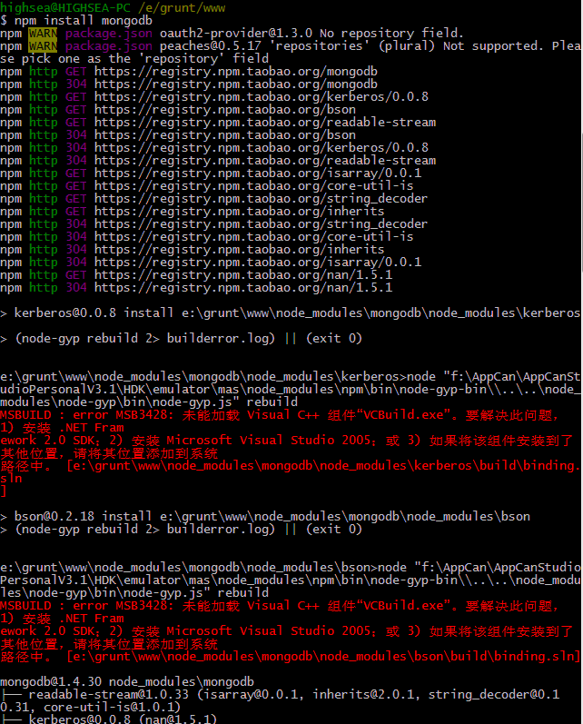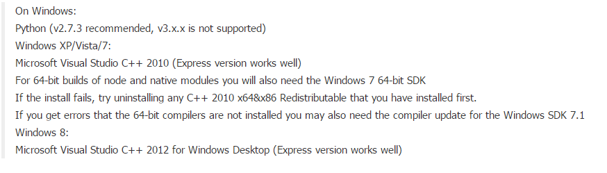 node,如無特定版本或更高版本,默認使用vs2005編譯工具(所以出錯提示的解決辦法一般為按照vs2005和framwork sdk2.0)