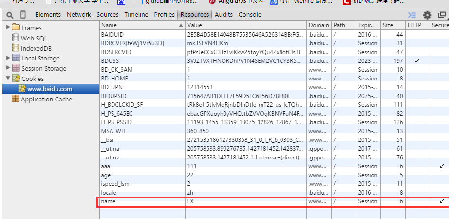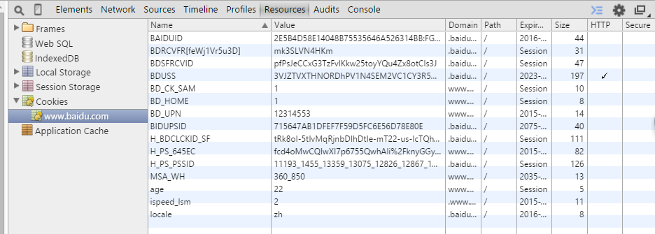 以本文百度這個為例,設為false的結果就是無論你在哪個協議下的百度頁面設cookie,那麼兩邊的百度頁面的cookie中都可以看到該字段。