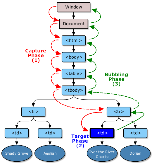 由上可以看出來,假如不停的刪除或添加li,則function()也要不停的更改操作,易出錯,因此推薦使用事件代理,在使用事件代理之前,我們先來了解一下事件階段(event phase):