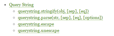 querystring.parse(str, [sep], [eq], [options])------將一個 query string 反序列化為一個對象。可以選擇是否覆蓋默認的分割符('&')和分配符('=')。