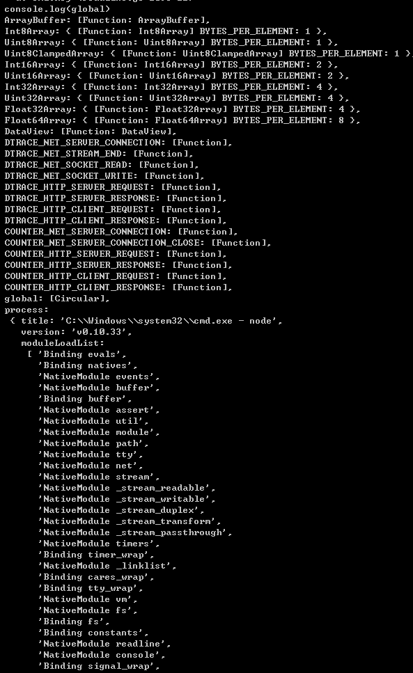 在REPL運行環境中,你可以通過如下語句來觀察Global對象中的細節內容,見下圖:
