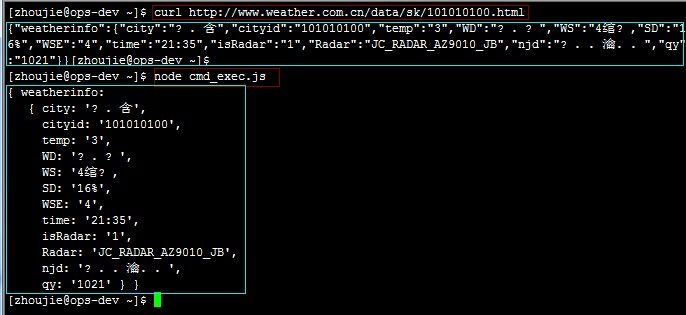 var cmdStr = 'curl http://www.weather.com.cn/data/sk/101010100.html';