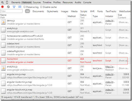 用浏覽器打開mobile-angular-ui-master/demo/index.html,發現沒加載樣式或者js。然後,審查元素後,發現加載的路徑不對,於是進行了以下修改