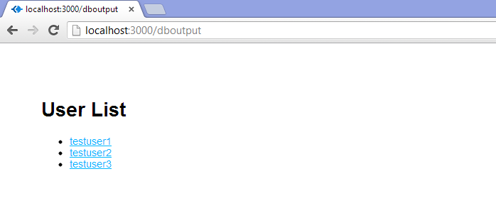 保存文件,重啟node服務器。希望你還記得怎麼重啟。打開浏覽器,訪問http://localhost:3000/userlist,你應該能看到這樣的界面:
