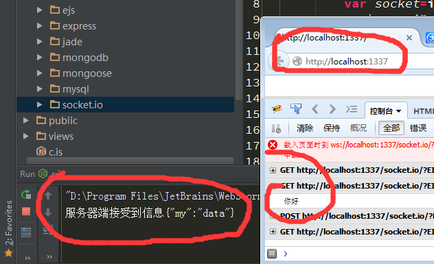 案例1:當服務器和客戶端連接後,向客戶端發送一個news事件,事件中攜帶一個對象,該對象的hello屬性值為"你好".在接收到客戶端發送my other event事件時,在控制台中輸出"服務器端就收到數據"+客戶端發送事件中攜帶的數據.