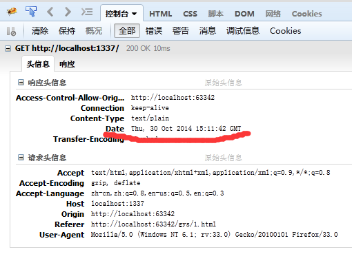 我們看一個HTML5頁面中通過AJAX請求的方式獲取HTTP服務器返回數據的代碼示例.由於我們把服務器的端口指定為1337,並將從端口為80的網站中運行HTML5頁面,因此這是一種跨域操作,需要在HTTP響應頭部中添加Access_Control_Allow_Origin字段,並且將參數指定為允許向服務器請求數據額域名+端口號(省略端口號時允許該域名下的任何端口向服務器請求數據),