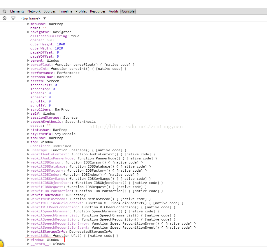 我們在浏覽器控制台中查看Window對象的結構;