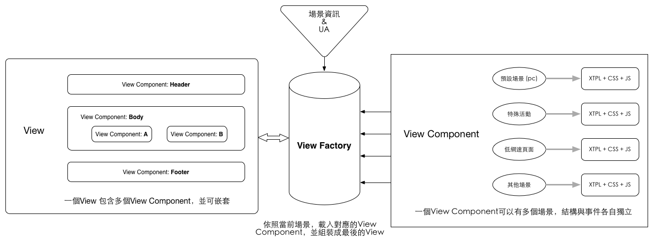 在這個方案裡面,Router、Controller 和 Model 都無需關注設備信息,終端類型的判斷完全交給展現層來處理。圖中主要的模塊是「View Factory」,Model 和 Controller 將數據和渲染邏輯傳遞過來之後,通過 View Factory 根據設備信息和其它狀態(不僅僅是 UA 信息、也可以是網絡環境、用戶地區等等)從一堆預設好的組件(View Component)中抓取特定的組件,再組合成最終的頁面。