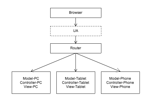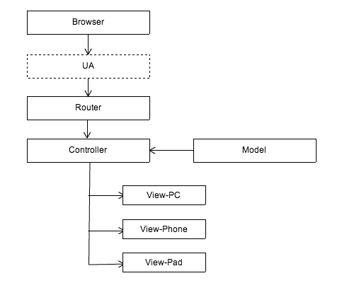 這種方案應該是最簡單粗暴的處理方法。通過路由(Router)將相同的 URL 統一傳遞到同一個控制層(Controller)。控制層再通過 UA 信息將數據和模型(Model)邏輯派發到對應的展現(View)進行渲染,渲染層則按預先的約定提供了適配幾個終端的模板。