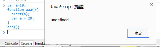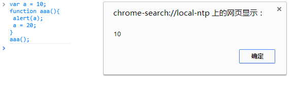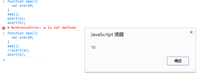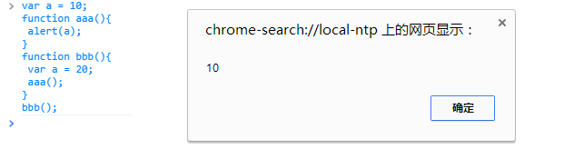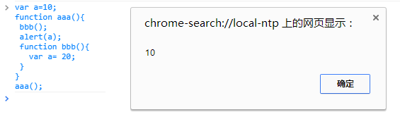 這是因為在alert(a)的時候,bbb函數中的a確實為20 ,可是它對於這時的alert(a)這句話來說是局部的,alert(a)根本找不到bbb函數中的a,所以在aaa函數中它找不到a,於是乎去外面找,一找,就找到了10。