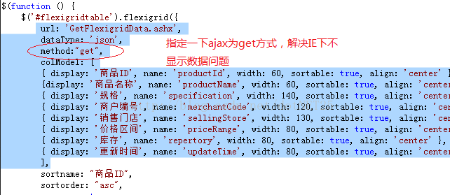 另外,flexigrid不是不可以使用“post”方式發送數據,而是“post”方式在IE下必須要有供post的數據,比如在分頁的時候可以使用post方式,而在你沒有什麼數據要發送的話,一定要使用“get”方式,其它浏覽器可能對這個要求不嚴格,而IE要求較嚴: