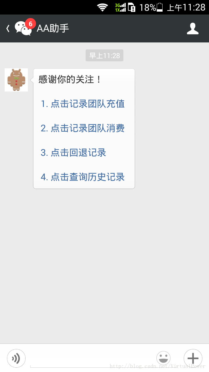 在這個實例中,筆者實際上搭建了一個微網站,通過Web頁面來記錄或顯示活動花費和余額。微信公眾號就相當於在用戶微信和微網站之間搭起了一個橋梁,當微信用戶關注筆者的公眾賬號時,通過微信公眾平台開發者模式,即可自動給微信用戶回復使用幫助。在幫助裡,包含了操作相應的web link,只需要點擊即可進入相應頁面。