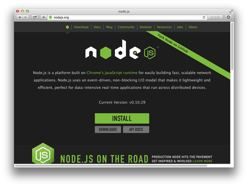 Node.js的安裝方法非常簡單,我們可以訪問Node.js官網,然後進點擊頁面中的INSTALL按鈕,可直接下載Node.js的pkg安裝文件包。