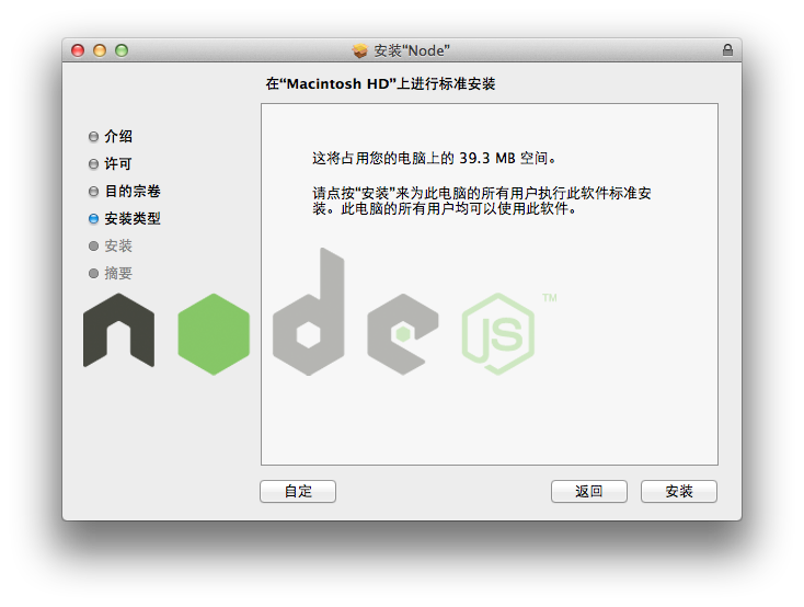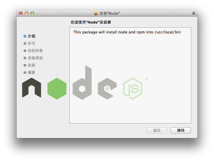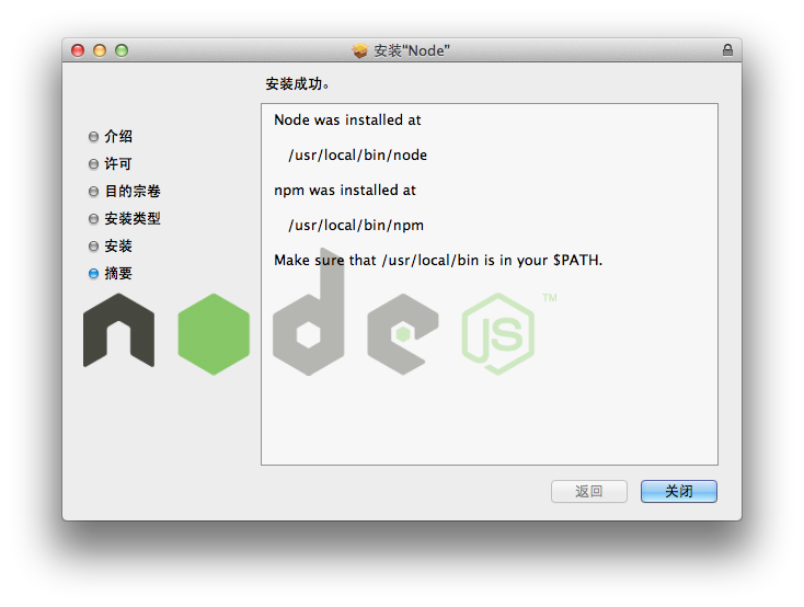 安裝完成界面,你的Node.js被安裝到 /usr/local/bin/node目錄下,同時該安裝包還會為你安裝npm工具。