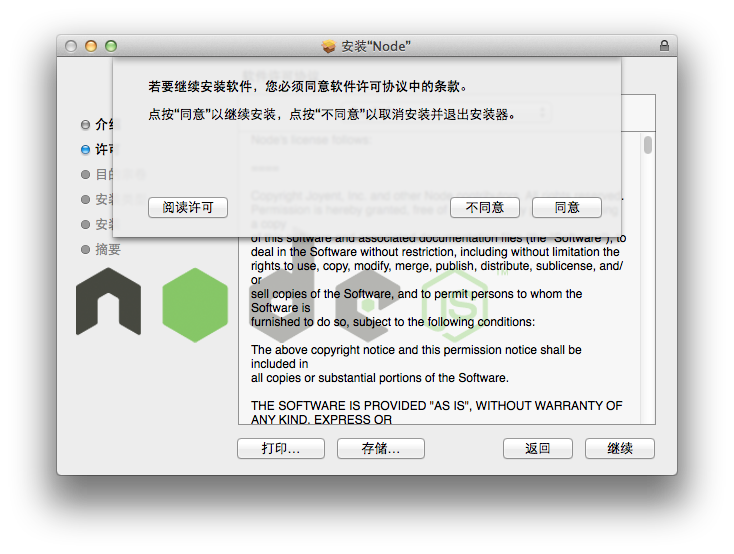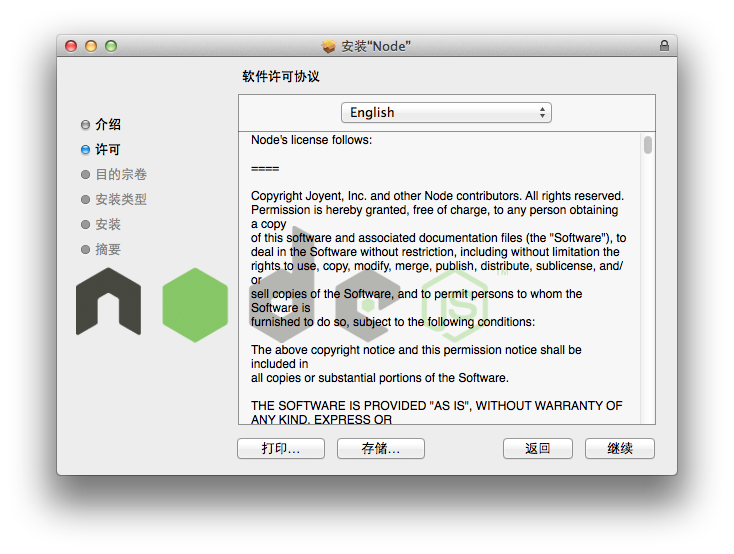 雙擊pkg安裝包,我們開始安裝Node.js。安裝過程如圖: