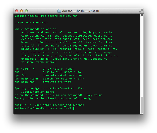 在終端中執行npm,出現如下圖內容,標明你的npm安裝正確。