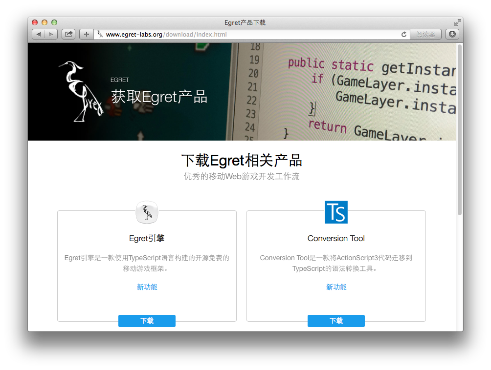 Egret提供兩個下載渠道,一個是Egret官方下載,另外一個是Egret Github下載。