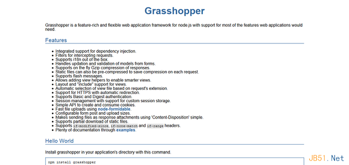 Grasshopper是一款功能豐富且非常靈活的Node.js框架,基本上支持所有的Web開發特性。推薦一個學習示例給大家。