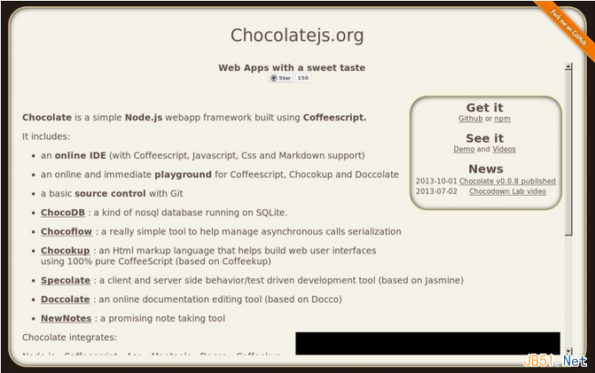 Chocolate.js是一個基於Node.js,使用CoffeeScript構建的簡單的Web應用框架(集合)。 想學習該框架的同學可以到這裡對其進行全面了解,並且裡面有大量的示例。