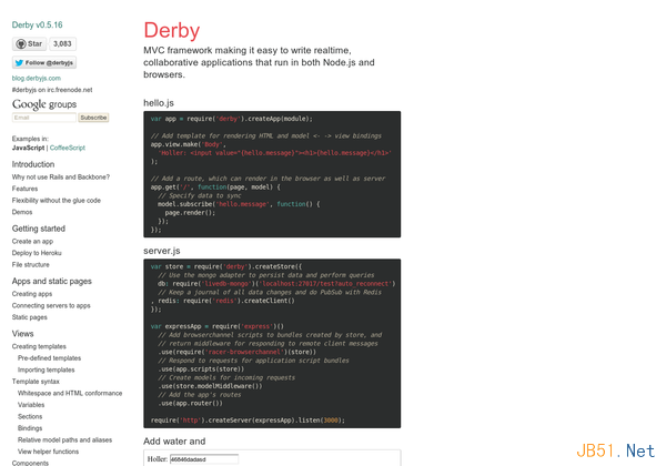 Derby是一個MVC框架,幫助編寫實時,交互的應用。可以運行在Node.js或者浏覽器環境中。還擁有一個數據同步引擎Racer。推薦兩個學習資源給大家:Node.js MVC:Express.js+Derby.js Hello World教程、使用Derby.js開發教程。