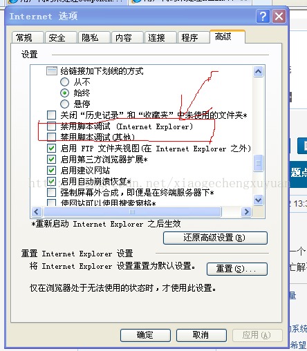 第一步:在需要打斷點處寫上 debugger; 第二部:在IE中將禁用腳本調試的鉤去掉 打開IE -> 工具 -> 選項 -> 高級 -> 去掉禁用腳本調試(Internet Explorer)和禁用腳本調試(其他) 不用調試時記得將IE去掉的鉤,鉤上,以免打開其它網頁報錯!