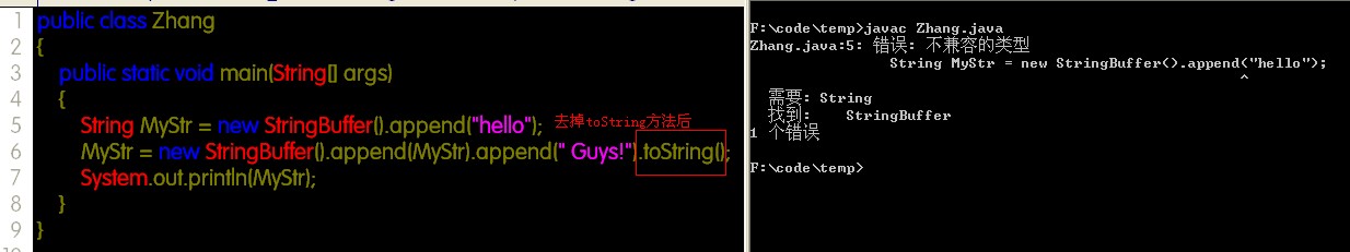 值得注意的是, 若希望將StringBuffer在屏幕上顯示出來, 則必須首先調用toString方法把它變成字符串常量, 因為PrintStream的方法println()不接受StringBuffer類型的參數.