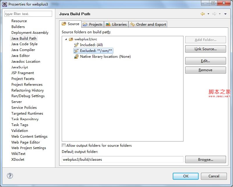 在Excluded中加入”**/.svn/**”,就可以將所有的svn文件排除在編譯路徑中了。