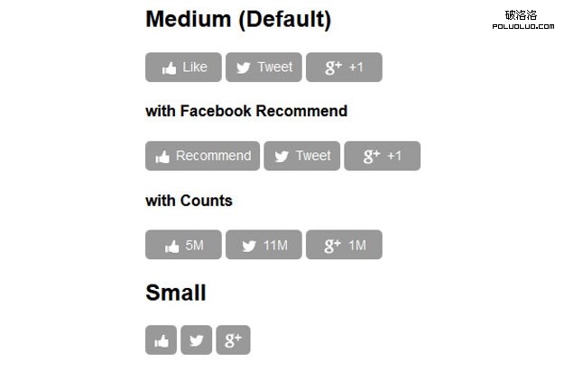 SocialCount是一個輕量級(2.93KB)和易於使用的jQuery插件支持逐步增強,延遲加載,移動友好的社交網絡部件。目前,它支持Facebook,Twitter和Google+的。演示