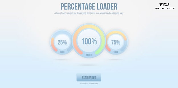 jQuery.PercentageLoader 這個jQuery插件能夠產生一種吸引人、更直觀醒目的方式顯示進度。它采用HTML 5 canvas 生成進度圖片。這個插件比通俗的程度進度條應用加倍炫酷的結果,圖形結果類似以前我們介紹的jQuery knob插件 ,這個插件應用快捷簡單,可以很是好的應用到現代浏覽器中。演示