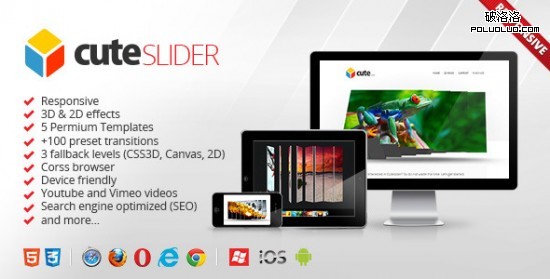 Cute Slider盡可能利用浏覽器最好的功能來實現3D和2D效果的Sliders。在基於webkit的浏覽器使用CSS3 Transform 3D。在其它支持HTML5的浏覽器,它使用canvas特性。在老的浏覽器中變成2D模式。