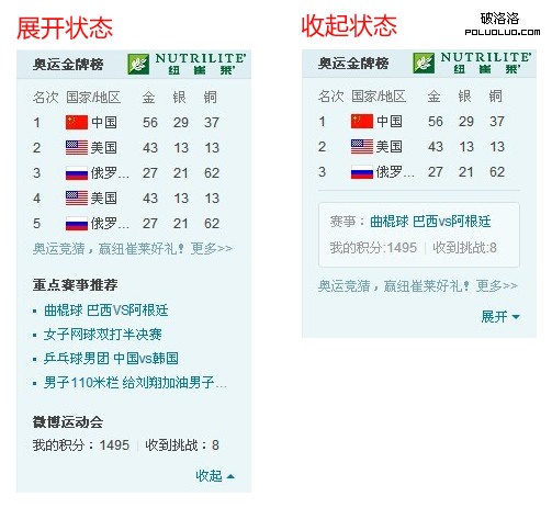 有時為了做到最簡,我們要考慮好久,前一陣子的倫敦奧運會,微博首頁右側要添加一個奧運金牌榜的模塊,要求有收起和展開的按鈕,用來顯示不同的內容。