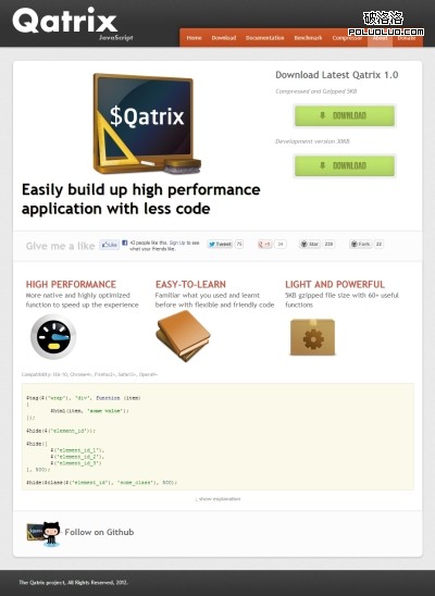 Qatrix的官方網站文檔清晰,每一個功能都帶有詳細的說明並附上例子,並且還提供了性能比較,JavaScript代碼壓縮(壓縮率比Packer還高)等實用功能。