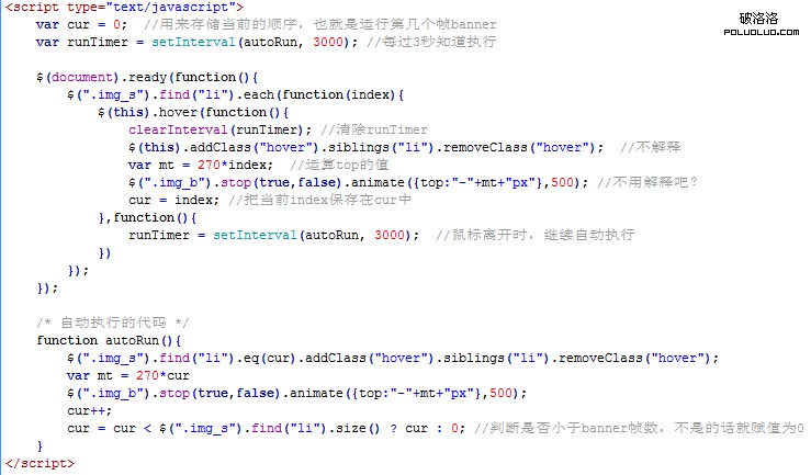 view sourceprint? 01.<!DOCTYPE html PUBLIC "-//W3C//DTD XHTML 1.0 Transitional//EN" "http://www.w3.org/TR/xhtml1/DTD/xhtml1-transitional.dtd"> 02.<html xmlns="http://www.w3.org/1999/xhtml"> 03.<head> 04.<meta http-equiv="Content-Type" content="text/html; charset=gb2312" /> 05.<title>DEMO 2012-10-18</title> 06.<style type="text/css"> 07.* {padding:0; margin:0} 08.ul, li {list-style:none} 09.body {font-size:12px; color:#333} 10..fl {float:left} 11..cf {zoom:1} 12..cf:after {clear:both; content:"."; display:block; height:0; visibility:hidden} 13..banner {padding:5px; border-right:1px solid #EFEFEF} 14..banner img {border:0 none} 15..img_wrap {width:190px; height:270px; overflow:hidden;} 16..img_b {position:relative} 17..img_b li {width:190px; height:270px; overflow:hidden} 18..img_s {padding:0 0 0 5px} 19..img_s li {margin:0 0 1px 0;width:49px; height:64px; padding:2px 1px 1px 5px;} 20..img_s li img {width:42px; height:60px} 21..img_s li.hover {background:url(/demo/pic/bsbg.jpg) no-repeat} 22.</style> 23.</head> 24. 25.<body> 26. 27.<div class="banner"> 28. <div class="cf"> 29. <div class="img_wrap fl"> 30. <ul class="img_b"> 31. <li><a href="#"><img src="/demo/pic/banner_a.jpg" alt="" width="190" height="270" /></a></li> 32. <li><a href="#"><img src="/demo/pic/banner_b.jpg" alt="" width="190" height="270" /></a></li> 33. <li><a href="#"><img src="/demo/pic/banner_c.jpg" alt="" width="190" height="270" /></a></li> 34. <li><a href="#"><img src="/demo/pic/banner_d.jpg" alt="" width="190" height="270" /></a></li> 35. </ul> 36. </div> 37. <ul class="fl img_s"> 38. <li class="hover"><a href="#"><img src="/demo/pic/banner_a.jpg" alt="" /></a></li> 39. <li><a href="#"><img src="/demo/pic/banner_b.jpg" alt="" /></a></li> 40. <li><a href="#"><img src="/demo/pic/banner_c.jpg" alt="" /></a></li> 41. <li><a href="#"><img src="/demo/pic/banner_d.jpg" alt="" /></a></li> 42. </ul> 43. </div> 44.</div> 45. 46.<script type="text/javascript" src="jquery-1.8.1.min.js"></script> 47.<script type="text/javascript"> 48. var cur = 0; //用來存儲當前的順序,也就是運行第幾個幀banner 49. var runTimer = setInterval(autoRun, 3000); //每過3秒知道執行 50. 51. $(document).ready(function(){ 52. $(".img_s").find("li").each(function(index){ 53. $(this).hover(function(){ 54. clearInterval(runTimer); //清除runTimer 55. $(this).addClass("hover").siblings("li").removeClass("hover"); //不解釋 56. var mt = 270*index; //運算top的值 57. $(".img_b").stop(true,false).animate({top:"-"+mt+"px"},500); //不用解釋吧? 58. cur = index; //把當前index保存在cur中 59. },function(){ 60. runTimer = setInterval(autoRun, 3000); //鼠標離開時,繼續自動執行 61. }) 62. }); 63. }); 64. 65. /* 自動執行的代碼 */ 66. function autoRun(){ 67. $(".img_s").find("li").eq(cur).addClass("hover").siblings("li").removeClass("hover"); 68. var mt = 270*cur 69. $(".img_b").stop(true,false).animate({top:"-"+mt+"px"},500); 70. cur++; 71. cur = cur < $(".img_s").find("li").size() ? cur : 0; //判斷是否小於banner幀數,不是的話就賦值為0 72. } 73.</script> 74.</body> 75.</html>如果有沒看懂哒,或者好的建議,歡迎留言~ 0.0