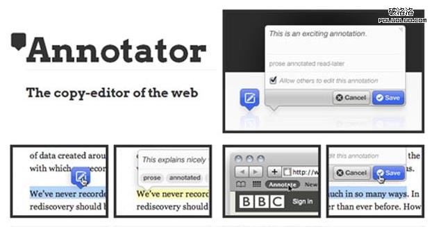 Annotator 是一個開源的JavaScript庫和工具,用於讓任意網頁變成可添加注釋。注釋可以有評論內容,標簽,用戶等。 Annotator擁有一個簡單而強大的插件體系,所以能夠很方便對其功能進行擴展:比如為注釋添加用戶身份驗證功能.