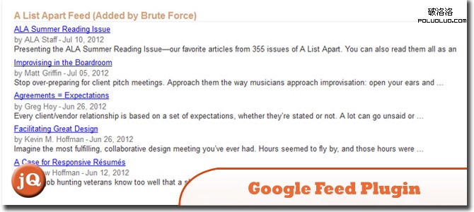 9. jQuery Google Feed Plugin Google Feed Plugin提供了服務器組件來幫助整合RSS閱讀器。只要客戶端包括最新的Google API腳本,開發者就可以在客戶端整合RSS訂閱功能。