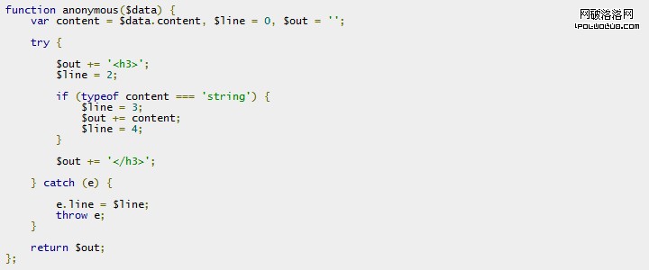 渲染錯誤一般是因為模板數據錯誤或者變量錯誤產生的,渲染的時候只有遇到錯誤才會進入調試模式重新編譯模板,而不會影響正常的模板執行效率。模板編譯器根據模板換行符記錄行號,編譯後的函數類似:
