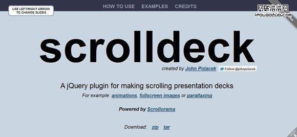 一款非常棒的自適應幻燈片插件,使用 Scrollorama 插件和鍵盤事件監聽來實現幻燈片的切換。