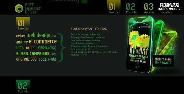 網站是由黑色、黃色和綠色三種顏色相結合制作。漂亮LOGO和菜單的懸停效果讓浏覽者流連忘返。