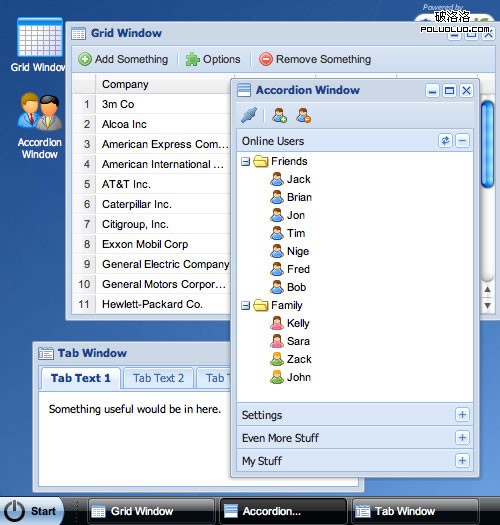 跟YUI一樣,ExtJS包括大量現成的組件,最強大的莫過於網格控件,它支持內聯編輯、過濾、分組、總結、緩沖和數據綁定。ExtJS的組件具有專業的外觀,完全主題化。其它組件包括tab切換、 圖表、窗體 (對話框)、 tree組件、布局管理器、 增強的表單控件、工具條、菜單、拖拽和遠程。如果你想尋找一套豐富的RIA組件,一定要查看ExtJS網站,這只是觸及到ExtJS表面的東西。圖3顯示了ExtJS開發的一個桌面,這說明該庫是如何的豐富而具有特色。