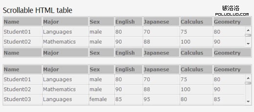 Scrollable HTML table - 將普通 HTML 表格變為可滾動狀態。將表頭部分放入 THEAD 區,內容部分放入 TBODY 區,腳注部分放入 TFOOT 區域,引用 webtoolkit.scrollabletable.js 文件,然後在每個表格後面創建 ScrollableTable() 對象即可(演示)。